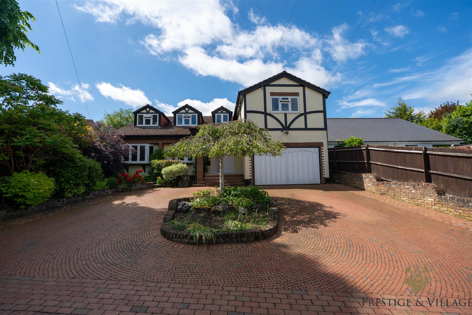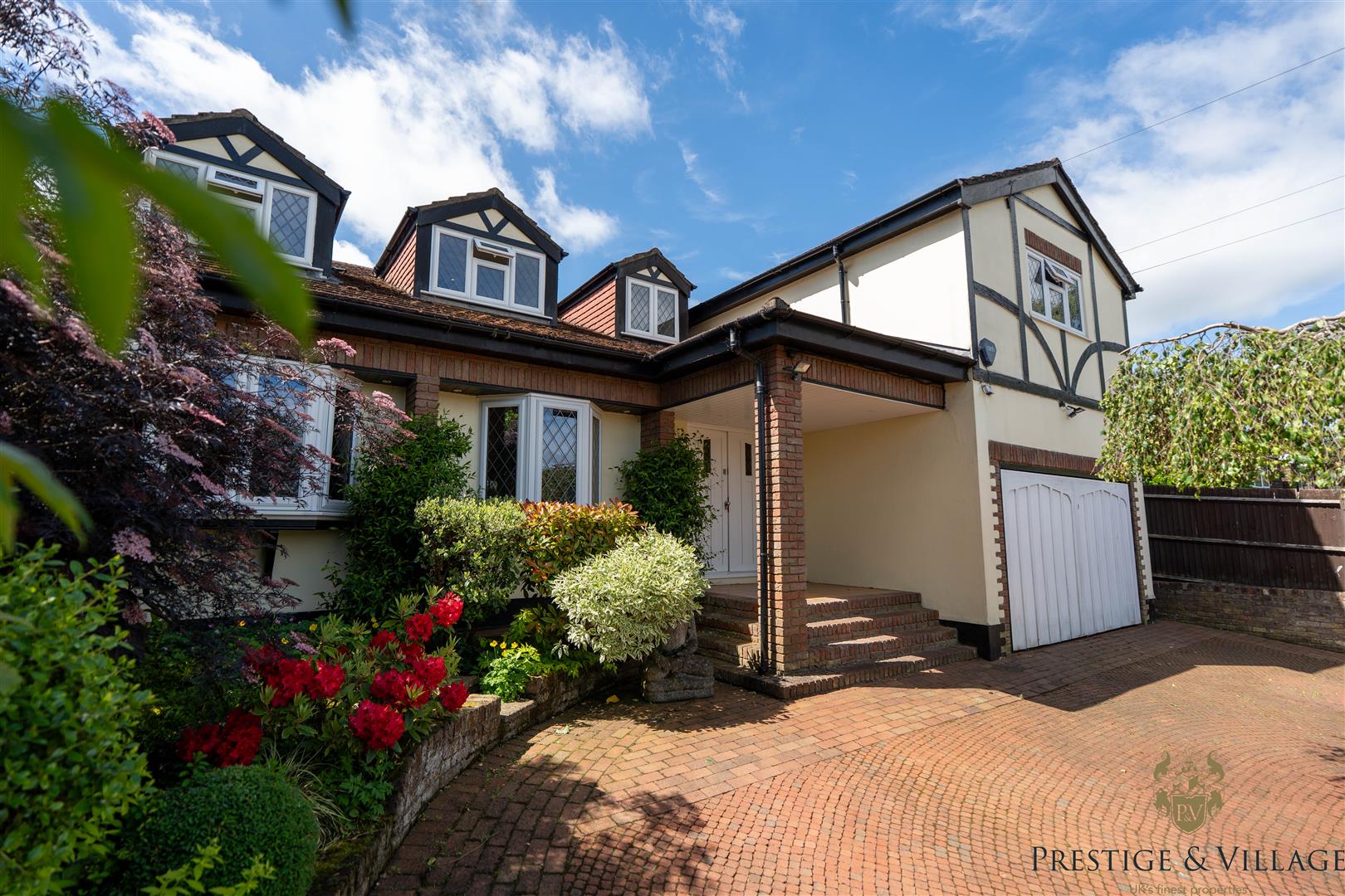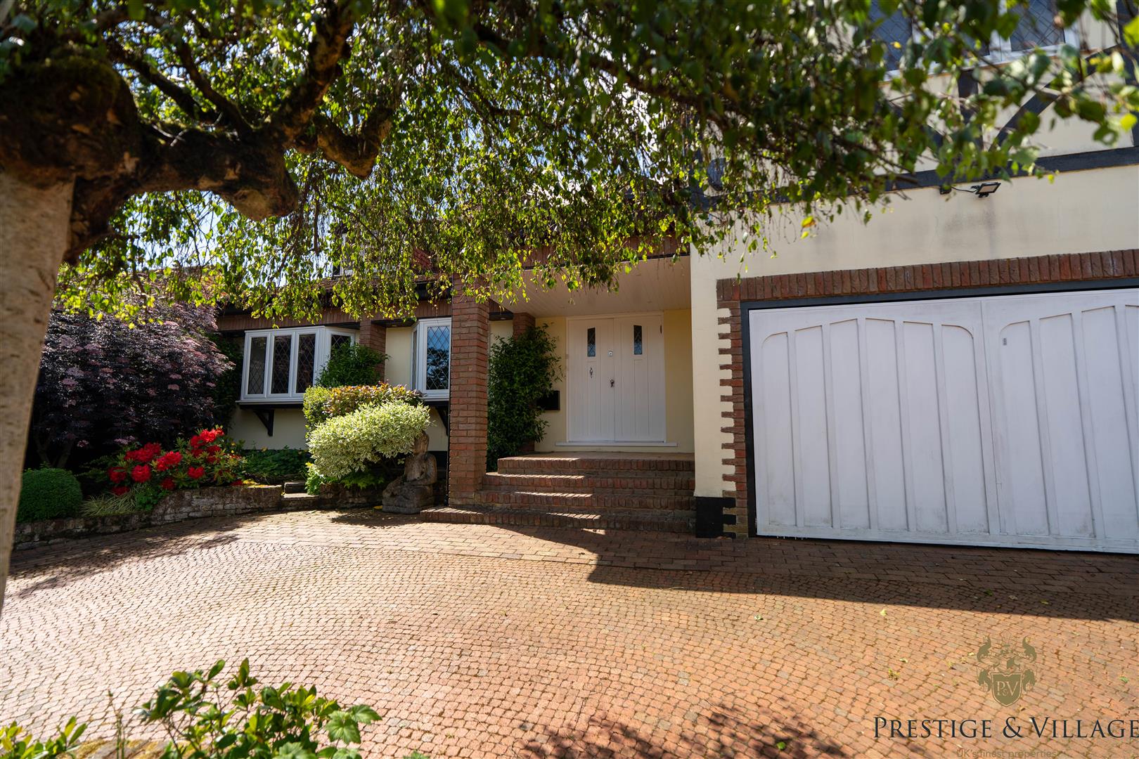 The rear of the property boasts a secluded south facing garden of approximately 60 feet—mainly laid to lawn with mature trees and planting—perfect for outdoor dining and family use. To the front, a carriage driveway offers parking for multiple vehicles and access to an integral double garage.
