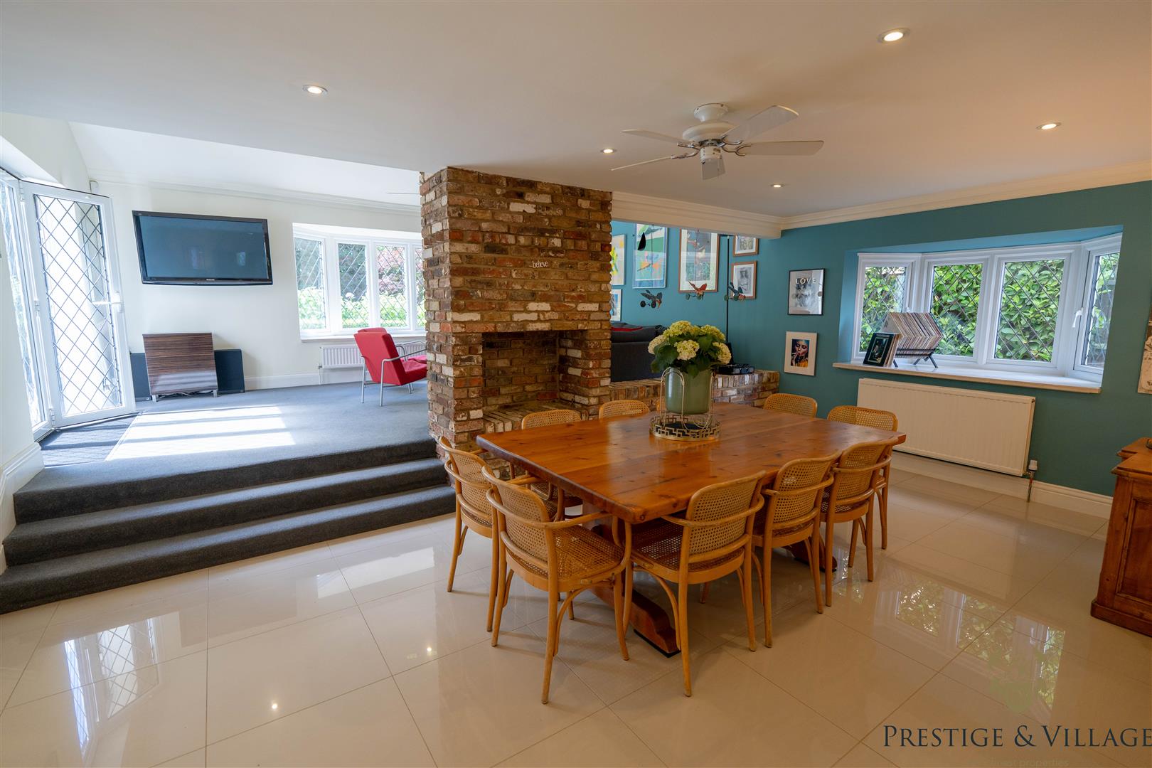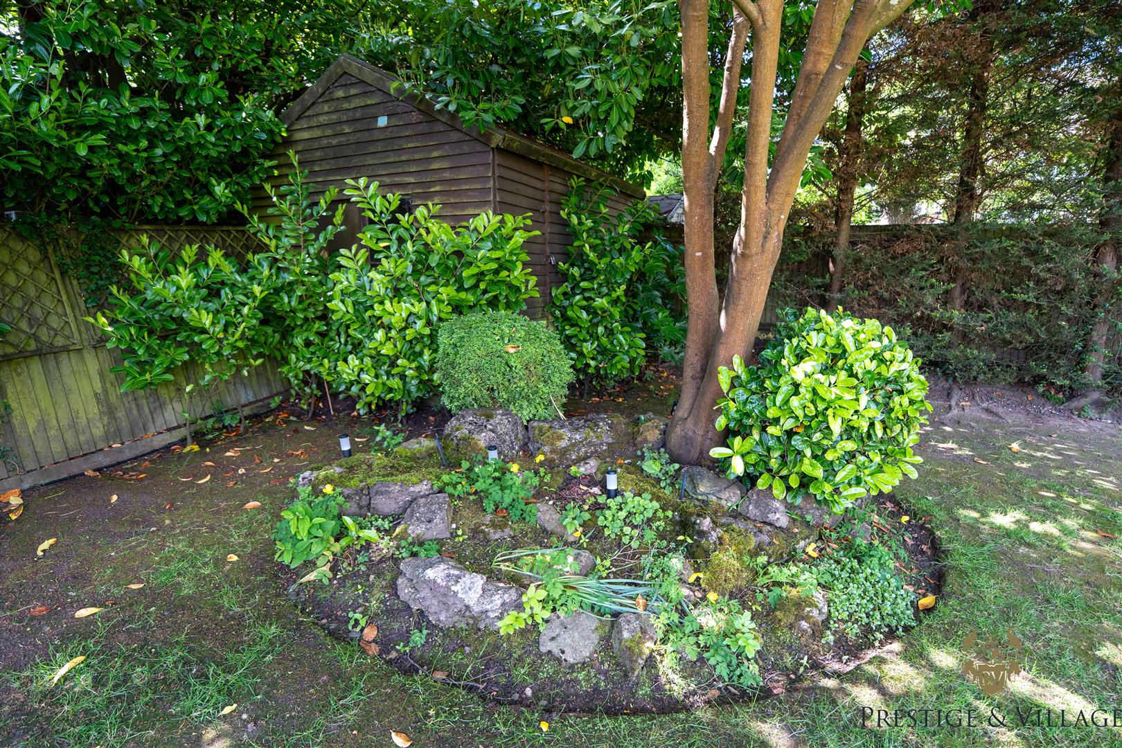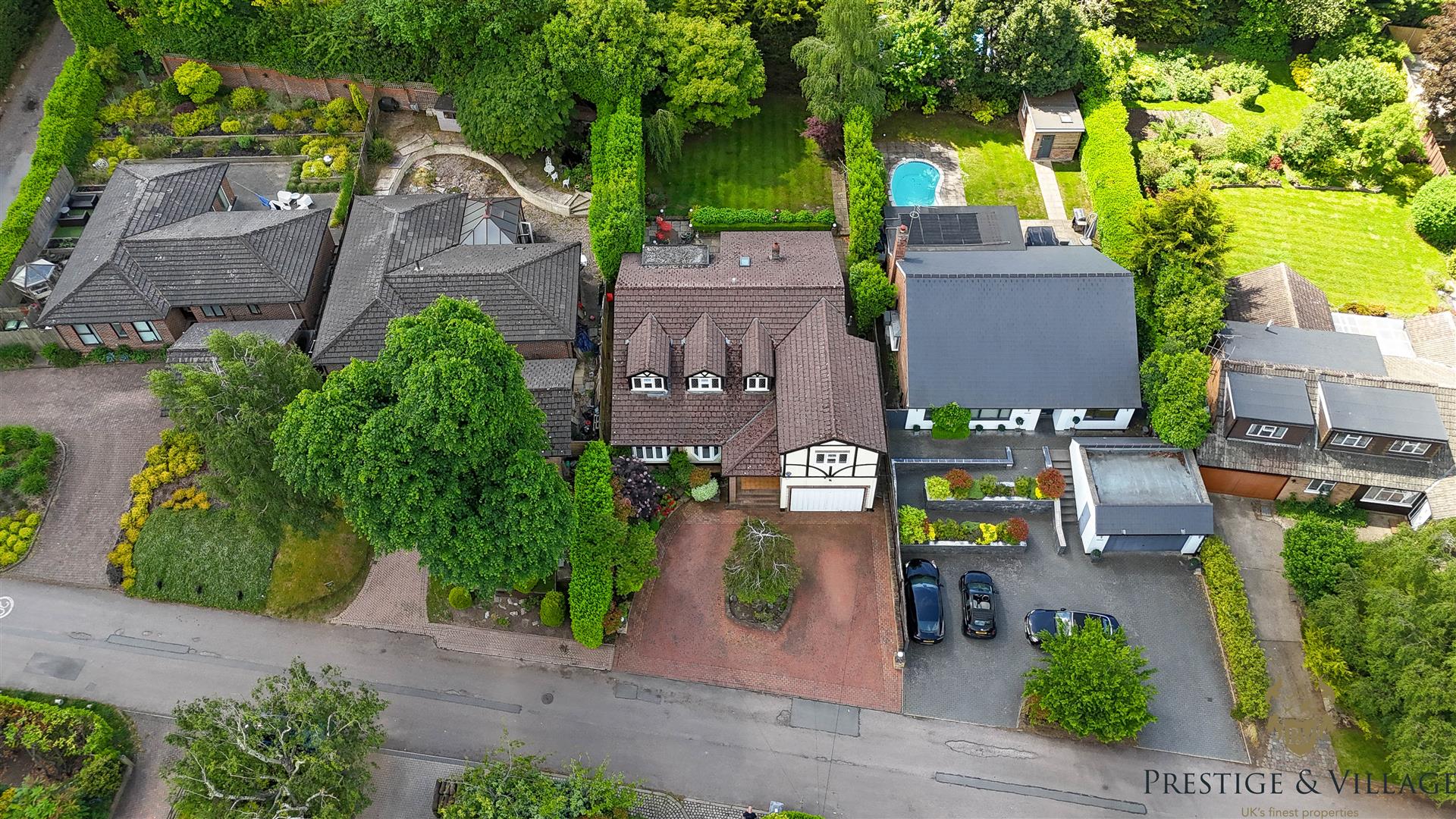 The rear of the property boasts a secluded south facing garden of approximately 60 feet—mainly laid to lawn with mature trees and planting—perfect for outdoor dining and family use. To the front, a carriage driveway offers parking for multiple vehicles and access to an integral double garage.