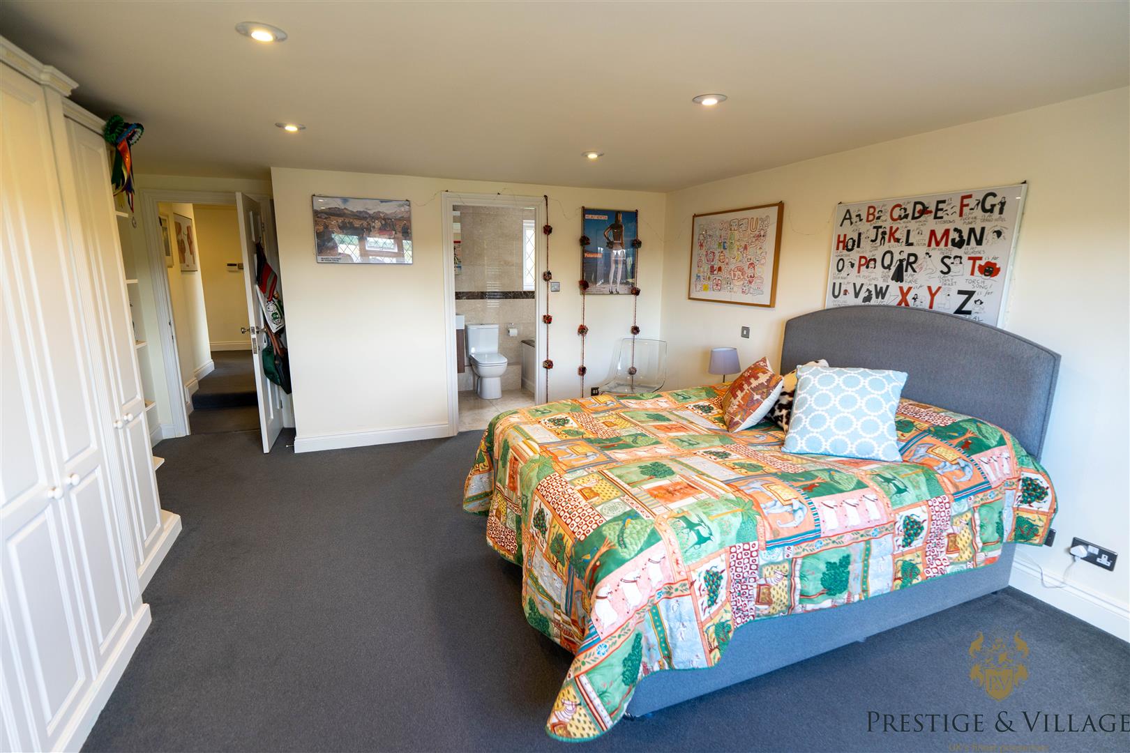 Upstairs, the principal bedroom suite features fitted wardrobes and a modern en suite. The second bedroom also includes an en suite and built-in storage, while three further bedrooms share a well-appointed family bathroom. A quiet study nook on the landing provides peaceful views across greenbelt land.